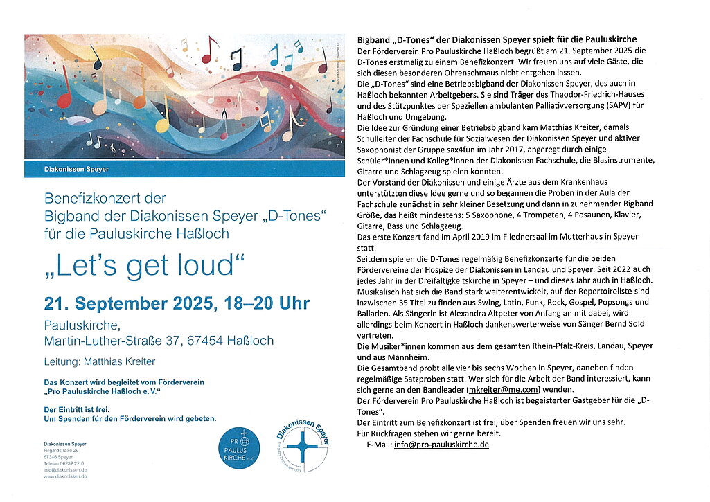 Wir freuen uns über Ihr Interesse an unserem Förderverein Pro Pauluskirche Haßloch e. V. In vielen Kirchengemeinden und in allen Landeskirchen muss gespart werden. Auch kirchliche Gebäude, wie unsere Pauluskirche in Haßloch, in der wir das Jahr hindurch in Gemeinschaft feiern, stehen zur Diskussion. Wir sind ein aktiver Verein mit dem großen Ziel vor Augen, unsere Pauluskirche zu erhalten. Helfen Sie mit durch eine Mitgliedschaft in unserem Förderverein, durch aktive Mitarbeit oder mit Spenden. Jede kleine und große Unterstützung (ob durch Ideen, durch Arbeitseinsatz, durch Nutzung oder Geldspende) ist hilfreich, sodass wir diesen Ort weiterhin als Gemeinschaft erleben können. Gerne kommen wir mit Ihnen ins Gespräch. Wir freuen uns auf Sie
