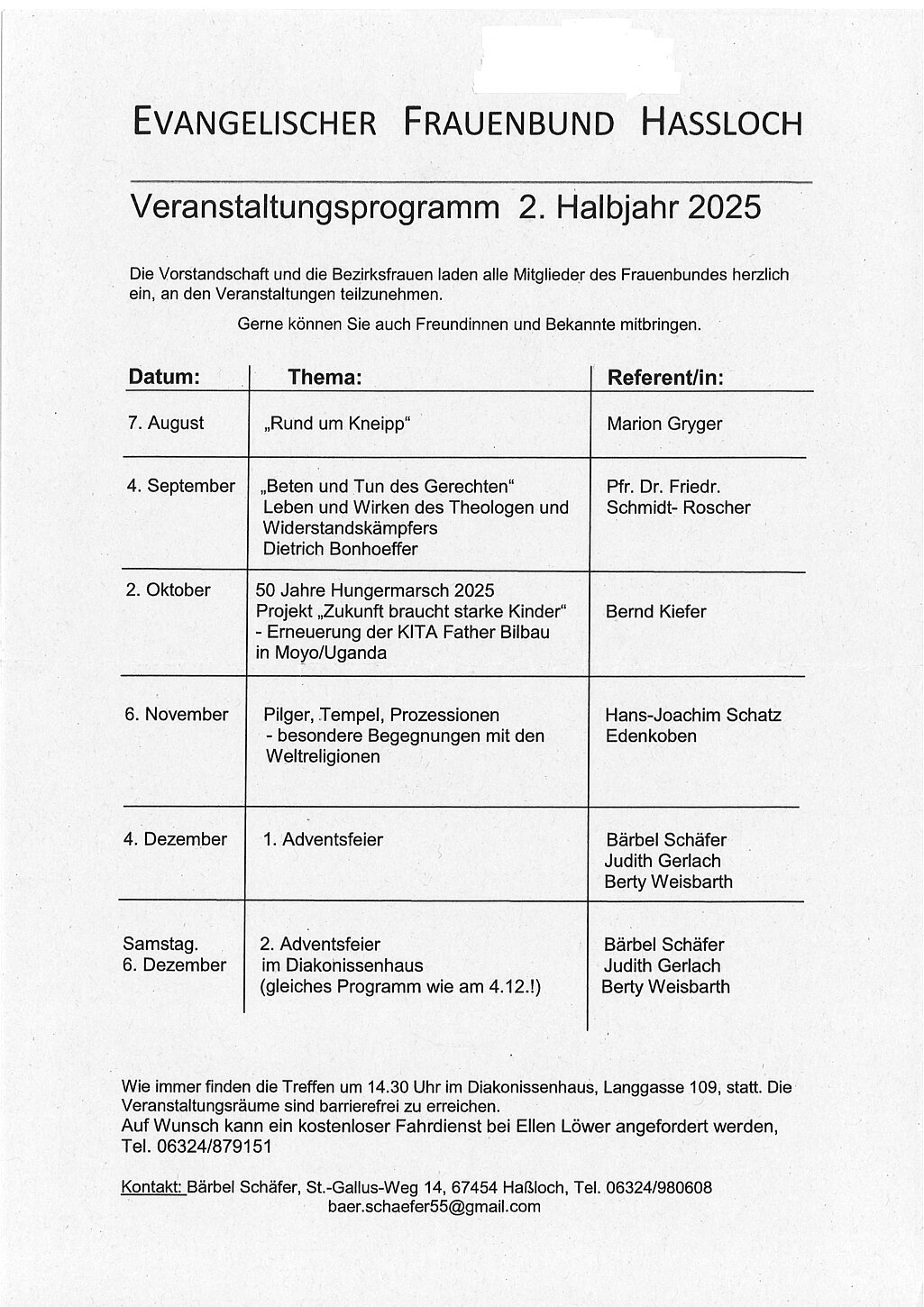 Der Ev. Frauenbund trifft sich am 1. Donnerstag im Monat um 14.30 Uhr im Diakonissenhaus, Langgasse 109.